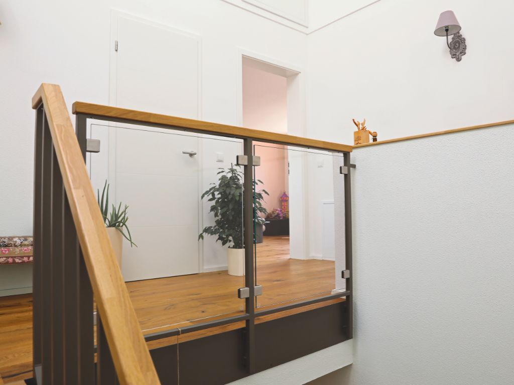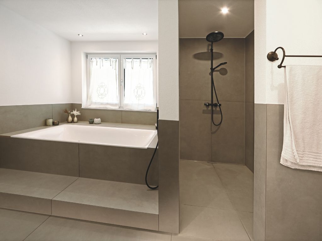 Im Dachgeschoss heißt eine Galerie ihre Besucher willkommen. Das Besondere: ein praktisches Dachflächenfenster sorgt hier für viel Tageslicht und spart tagsüber Strom. Links von der Treppe kommt man direkt in den Elternbereich, bestehend aus einem großen Schlafzimmer, einer ebenfalls großen Ankleide mit deckenhohen Schrankwänden sowie direktem Zugang zur Dachterrasse. Das daneben liegende große Elternbadezimmer gleicht einem echten Wellnessparadies. Betongraue Fliesen schaffen einen modernen Kontrast zur weißen Wandfarbe sowie dem Echtholzfurnier der Badezimmermöbel. Die große, rechteckige Badewanne wurde direkt neben der bodengleichen Regenwasserdusche gebaut, wodurch eine kleine Badeoase geschaffen wurde. Eine Stufe sorgt zudem für einen leichteren Einstieg. Ein WC und ein Bidet vollenden das private Wellnessparadies.