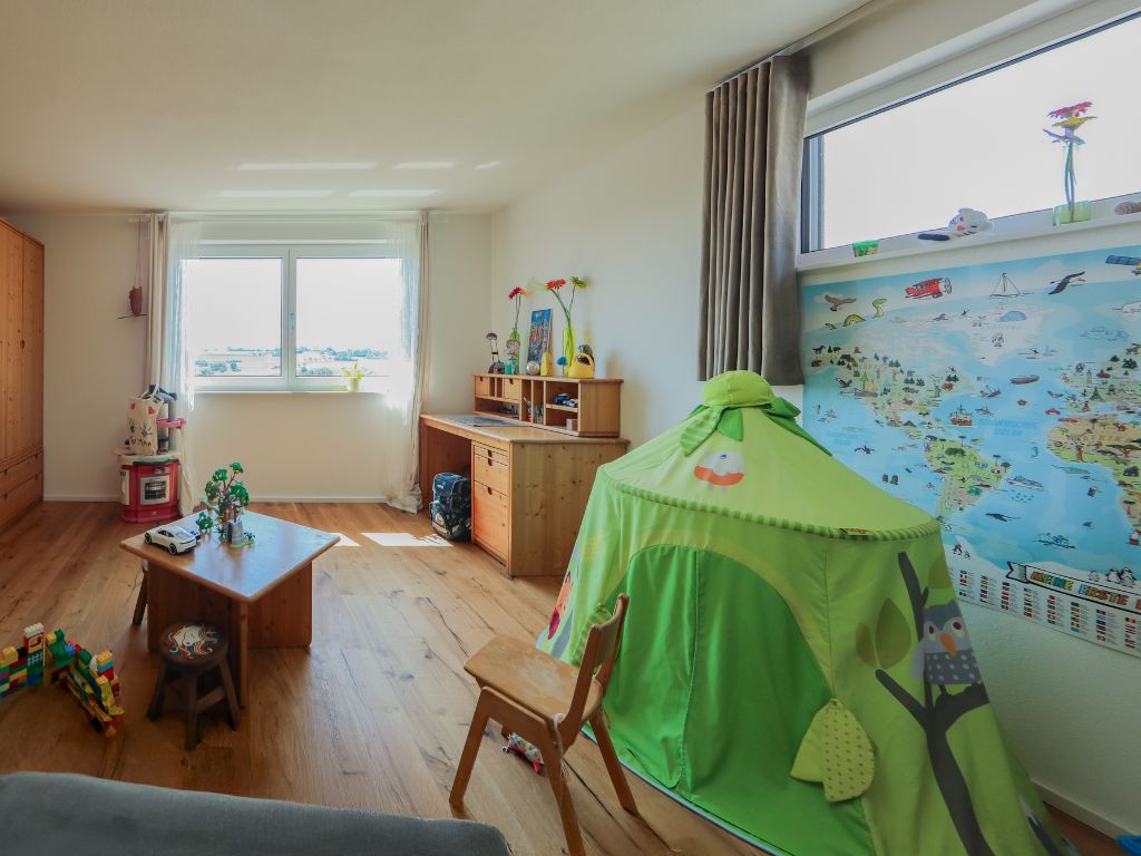 Neben dem Elternbad befindet sich ein weiteres Badezimmer – diesmal für die Kinder – mit Dusche, Waschtisch und WC. Die beiden Kinderzimmer liegen links neben der Treppe. Trotz unterschiedlicher Raumaufteilung sind sie etwa gleich groß. So haben die Kinder für ihre jeweiligen Bedürfnisse gleich viel Platz zum Lernen, Spielen und Erholen.