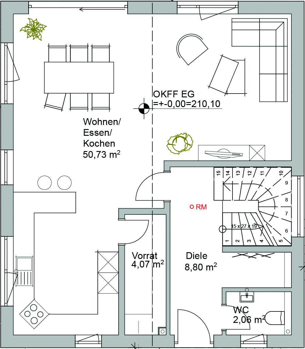 Ausgestattet wurde das als Effizienzhaus 55 ausgeführte Massivhaus mit einer hocheffizienten Luft/Wasser-Wärmepumpe sowie Lüftungsanlage. Zusätzlich wurde eine Photovoltaikanlage zur späteren Inbetriebnahme vorbereitet sowie ein etwa 40 m tiefer Brunnen im Garten erschlossen.